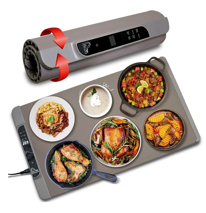 ⦁ Full-Surface Heating with Adjustable Temperature (120°F–210°F) Easily set your desired heat between 120°F and 210°F (50°C to 100°C). The mat delivers even warmth across its entire surface, making it ideal as an electric food warmer for plates, casseroles, pizza, soups, and more.
