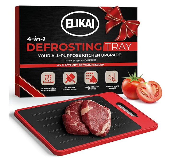 ⦁ MULTIFUNCTIONAL 4-IN-1 DESIGN: The ELIKAI defrosting tray for frozen meat combines a meat thawing tray, built-in knife refiner, garlic grater, and cutting board, offering a versatile thawing plate for efficient meal prep.